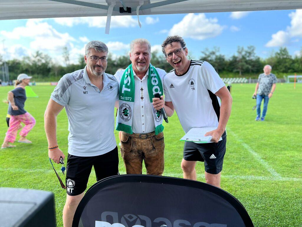 von links nach rechts: Martin Trissler (Mitorganisator und Abteilungsleiter Fußball), 1. Bgm. von Neuried Harald Zipfel, Christoph (allerbester Turniersprecher)